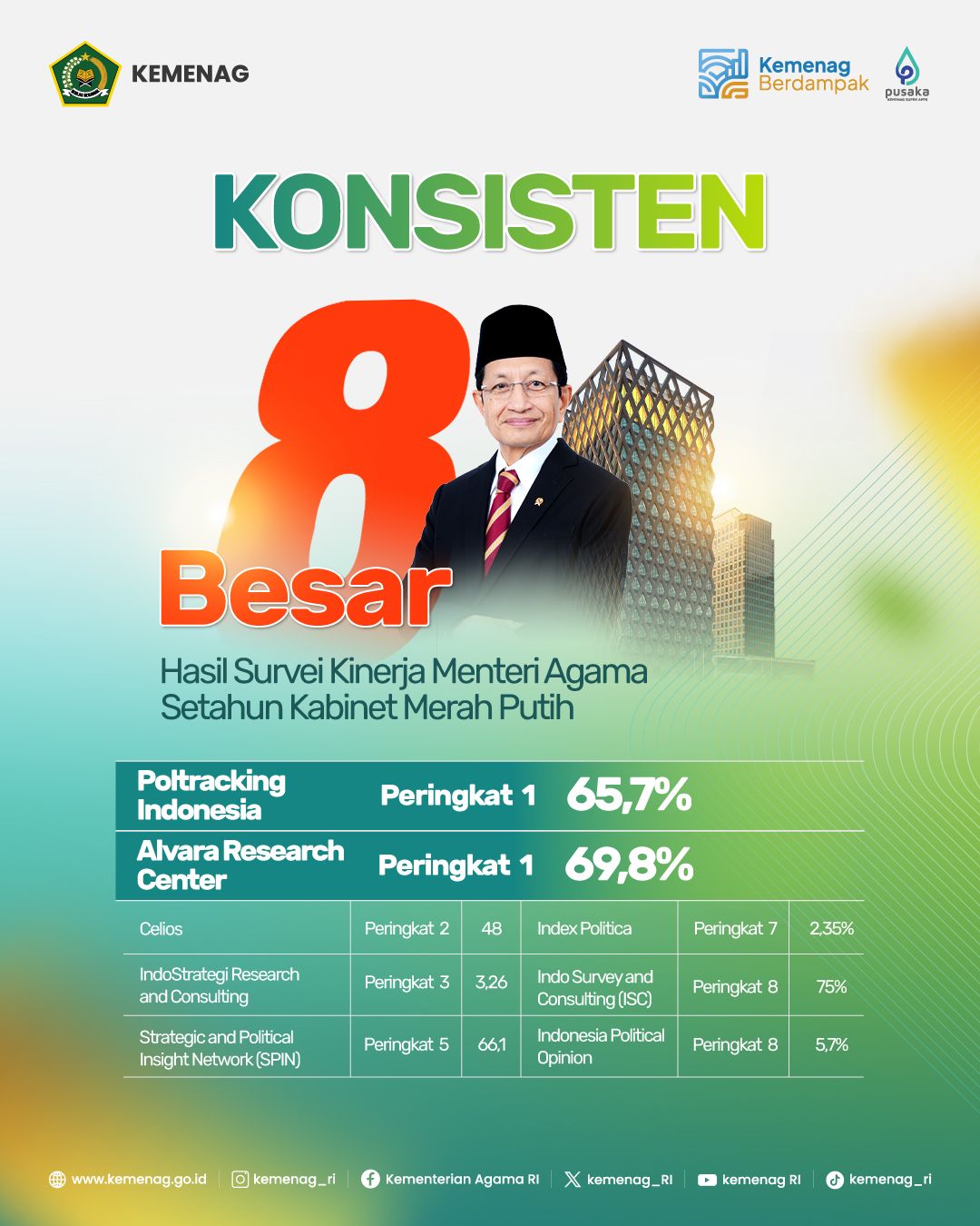 Setahun Kinerja, Menag Nomor Satu Kategori Berikut posisi Menteri Agama pada hasil sejumlah survei kinerja setahun kabinet merah putih: